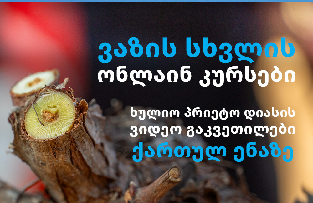 - ქართველ მევენახეებს ონლაინ ვიდეო კურსების მეშვეობით ვაზის ზამთრისა და მწვანე სხვლის შესახებ სიღრმისეული ცოდნის შეძენის შესაძლებლობა აქვთ. გაეროს სურსათისა და სოფლის მეურნეობის ორგანიზაციის (FAO) ვენახის ინტეგრირებული მართვის საერთაშორისო ექსპერტის, ხულიო პრიეტო დიაზის ქართულ ენაზე გახმოვანებული ვიდეო კურსები ხელმისაწვდომია ვებსაიტზე pruning.ge. ონლაინ საგანმანათლებლო პლატფორმა FAO-ს მხარდაჭერითა და ევროკავშირისა და შვედეთის დაფინანსებით შეიქმნა ENPARD IV პროგრამის ფარგლებში.