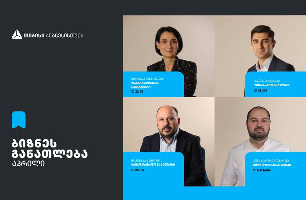 - თიბისი ბიზნესის მხარდაჭერით, აპრილის თვეში, ხუთი სხვადასხვა თემატიკის შეხვედრა გაიმართება. ბიზნესების წარმომადგენლებს შესაძლებლობა ექნებათ, პროფესიონალი ტრენერებისგან მათთვის საინტერესო საკითხებზე მიიღონ ამომწურავი ინფორმაცია და მიღებული ცოდნით, საკუთარი ბიზნესის განვითარებას შეუწყონ ხელი.