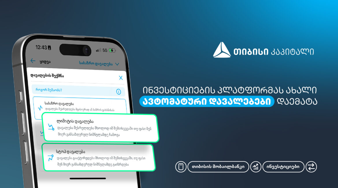- თიბისის მობაილბანკის ინვესტიციების პლატფორმას ლიმიტ და სტოპ დავალებები დაემატა. ახლა უკვე შეგიძლია აქციები შენთვის სასურველ ფასად იყიდო ან გაყიდო – ბაზარზე მუდმივი დაკვირვების გარეშე.
