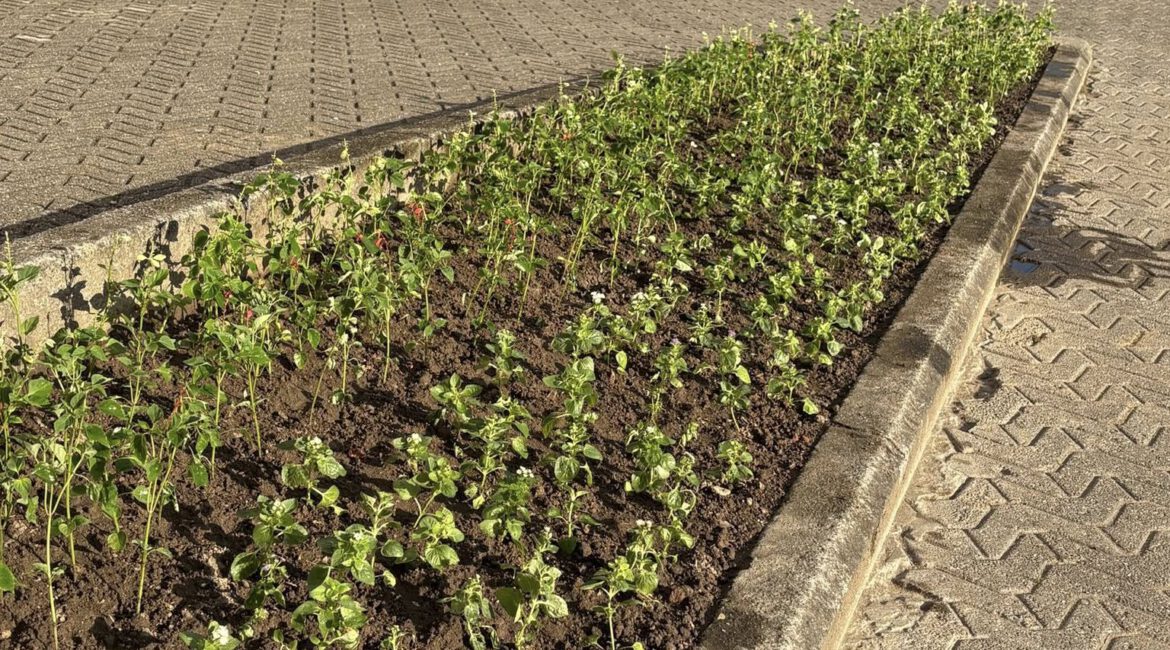 წითელი და თეთრი სალვიითა და აგერატუმით ნიკოსეული სასახლის მიმდებარე ტერიტორია ყვავილოვან კუთხეებად გარდაიქმნა.