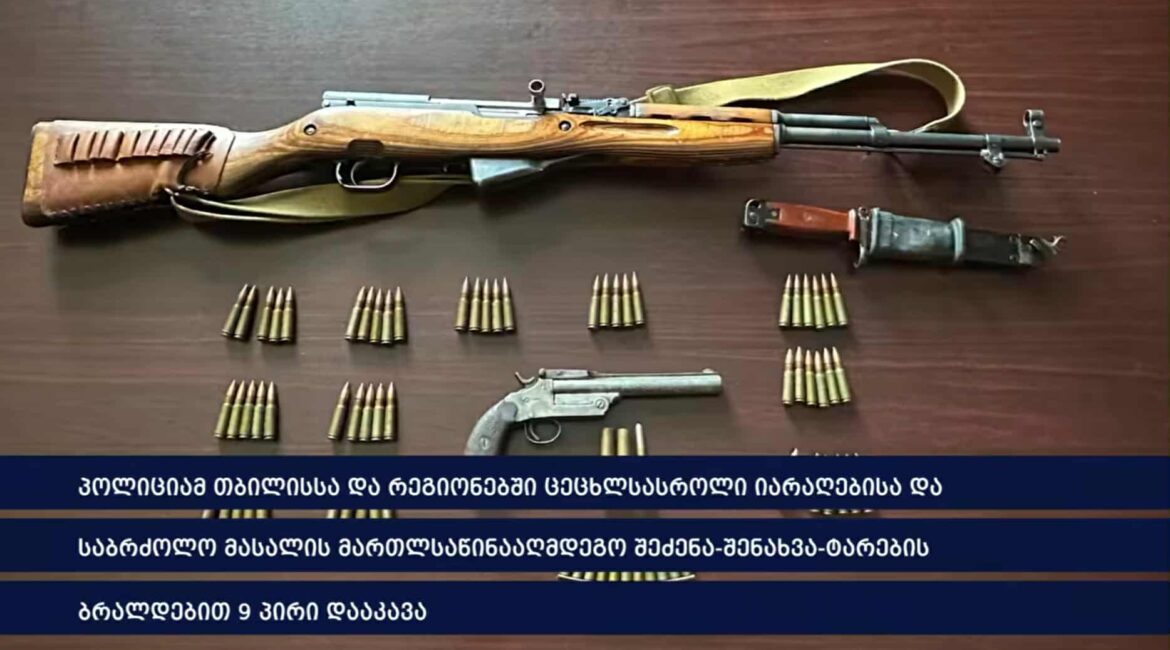 - შინაგან საქმეთა სამინისტროს საპატრულო პოლიციის დეპარტამენტის კახეთისა და მცხეთა-მთიანეთის მთავარი სამმართველოების, ასევე, თბილისის, იმერეთის, რაჭა-ლეჩხუმის, ქვემო სვანეთისა და სამეგრელო-ზემო სვანეთის პოლიციის დეპარტამენტების თანამშრომლებმა, სხვადასხვა დროს ჩატარებული ოპერატიული ღონისძიებებისა და საგამოძიებო მოქმედებების შედეგად, უკანონო ცეცხლსასროლი იარაღები და საბრძოლო მასალა ამოიღეს – დაკავებულია 9 პირი.