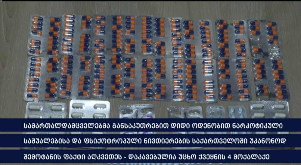 “განსაკუთრებით დიდი ოდენობით ნარკოტიკული საშუალებისა და ფსიქოტროპული ნივთიერების უკანონო შეძენა-შენახვის და საქართველოში შემოტანის ბრალდებით დაკავებული არიან: 2003 წელს დაბადებული მ.მ., 1998 წელს დაბადებული ა.ბ., 1981 წელს დაბადებული ჰ.დ. და 1993 წელს დაბადებული ბ.ფ.