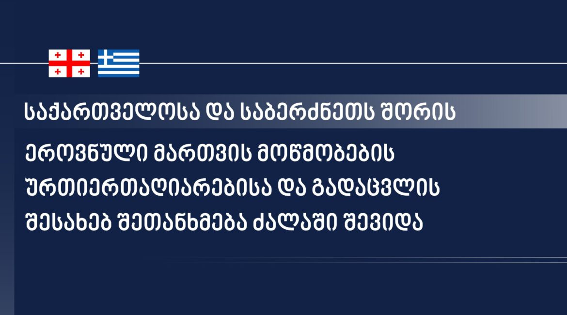 - საქართველოს მთავრობასა და საბერძნეთის რესპუბლიკის მთავრობას შორის, ეროვნული მართვის მოწმობების ურთიერთაღიარებისა და გადაცვლის შესახებ შეთანხმება, ძალაში მიმდინარე წლის 21 ივნისიდან შევიდა. ინფორმაციას ამის შესახებ შინაგან საქმეთა სამინისტრო ავრცელებს.